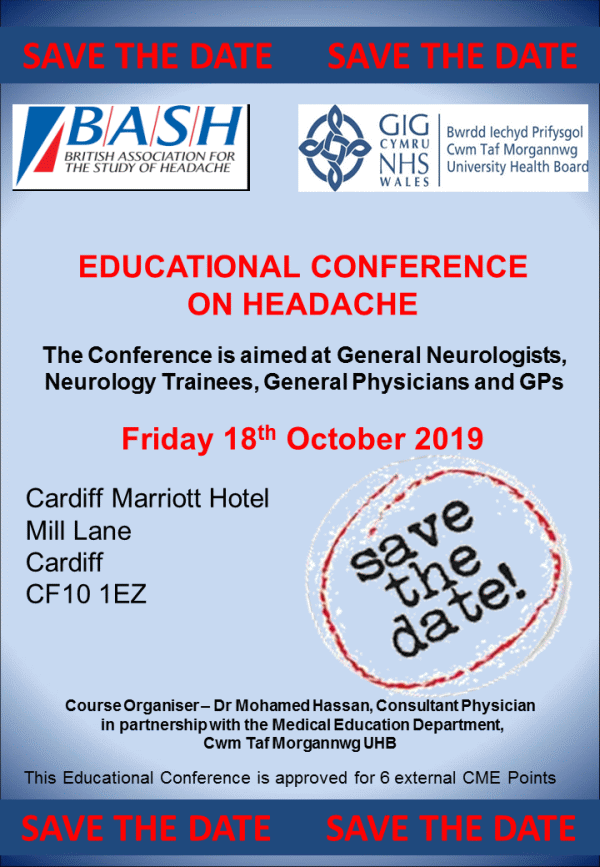 Mohamed Hassan (an acute physician from Prince Charles, Merthyr) is organising a conference on headaches in Cardiff on Friday 18th October. Headaches are his special interest and regardless of whether they might interest you personally or not, they’re certainly a common and important problem that we see a lot of in acute medicine!